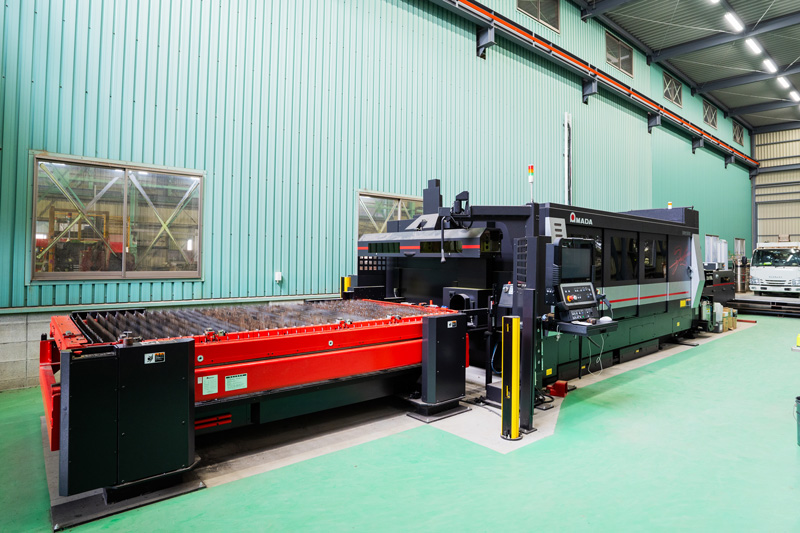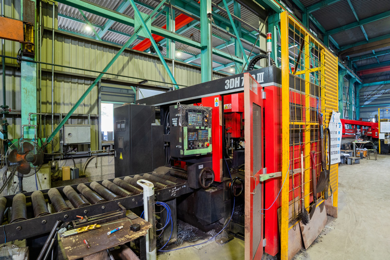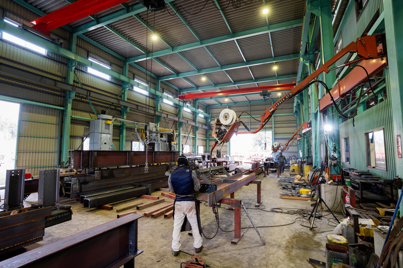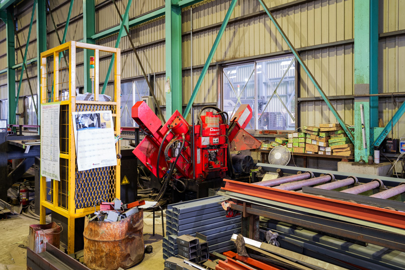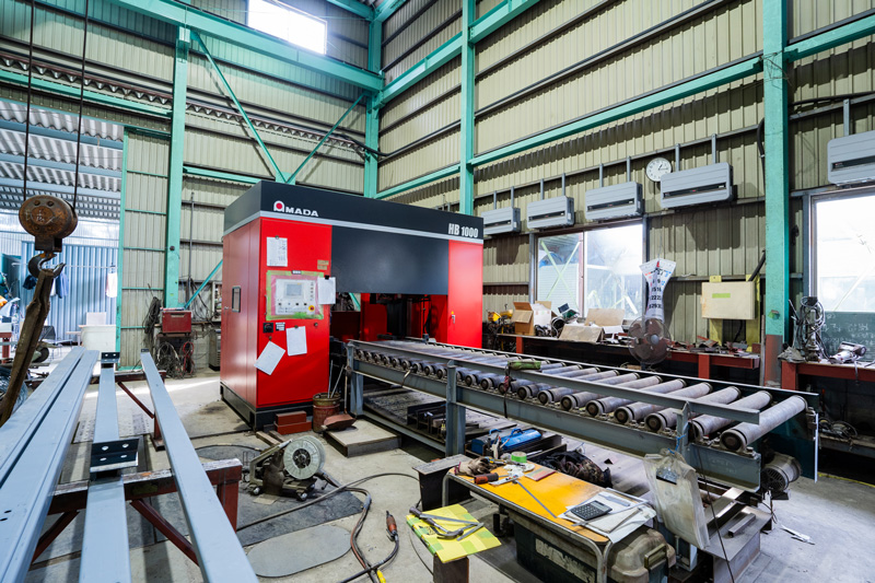 鉄骨製造の設計から、製造、現場施工まで、自社で一貫して行っています。一般的な建築鉄骨製造工場(鉄骨ファブリケーター)の多くが外注している一次加工(切断・孔あけ等)も自社工場で行っており、すべての工程をトータルで対応します。